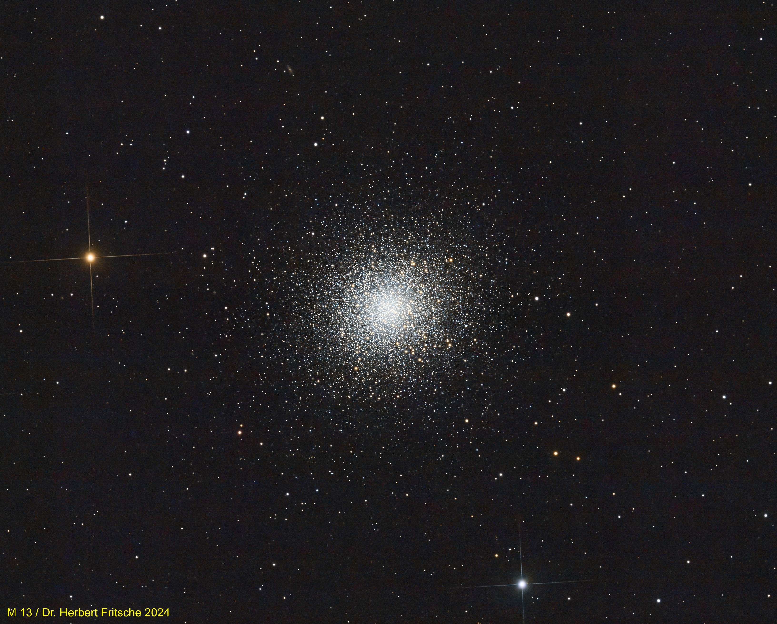 M13 ist der hellste Kugelsternhaufen am Nordhimmel. Er ist etwa 25 100 Lichtjahre von der Sonne entfernt.