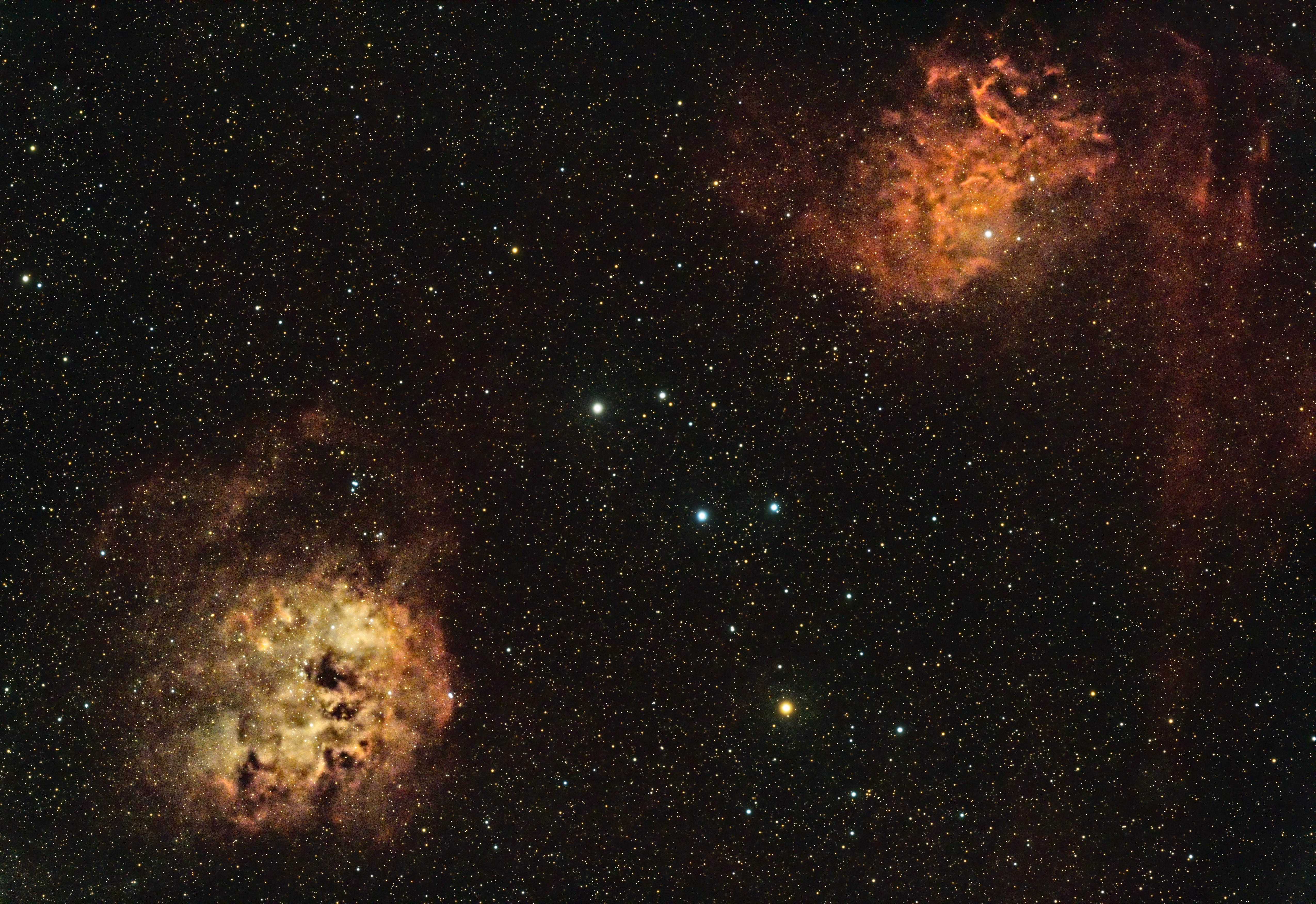 IC 410 (Kaulquappennebel) und IC 405 (Flammensternnebel) sind zwei diffuse Nebel im Sternbild Fuhrmann (Auriga).