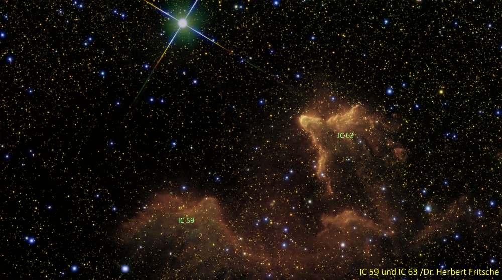 Dieser ist 3 bis 4 Lichtjahre vom Emissionsnebel IC 63 und vom Reflexionsnebel IC 59 entfernt.