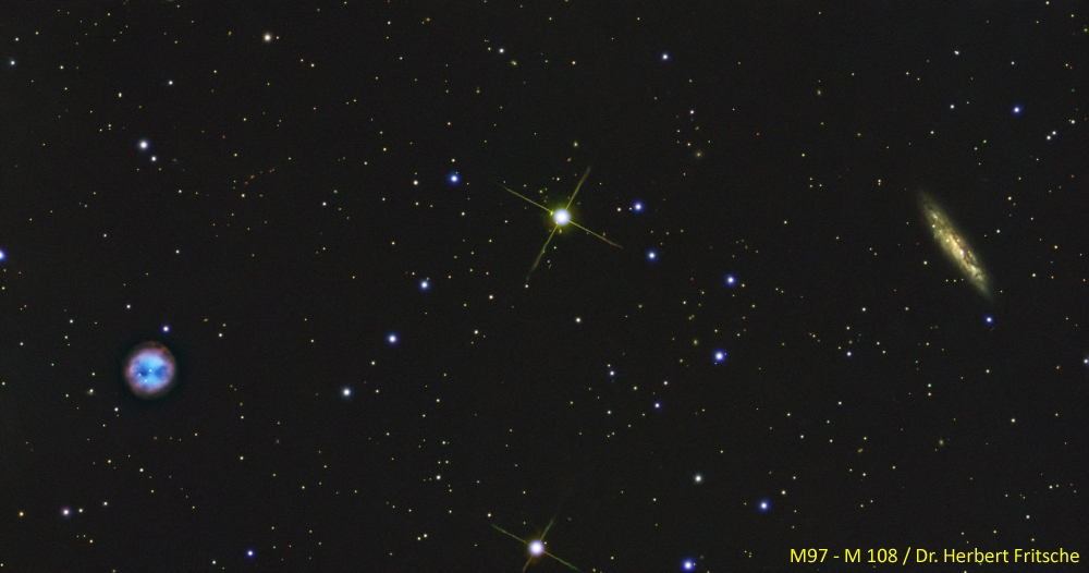 M 97 (Eulennebel) ist ein etwa 2 000 LJ entfernter planetarischen Nebel in unserer Milchstraße. Er ist schätzungsweise etwa 8000 Jahre alt