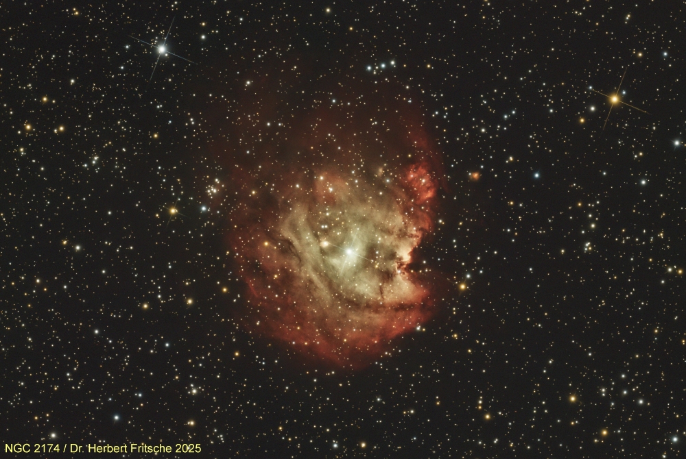 NGC 2174 ist ein H-II-Emissionsnebel im Sternbild Orion, der etwa 6400 Lichtjahre von der Erde entfernt ist.
