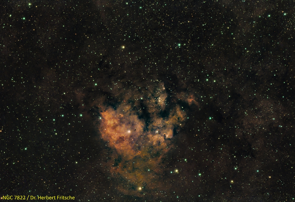 NGC 7822 ist ein Emissionsnebel, der ca. 4 000 Lj. entfernt ist.